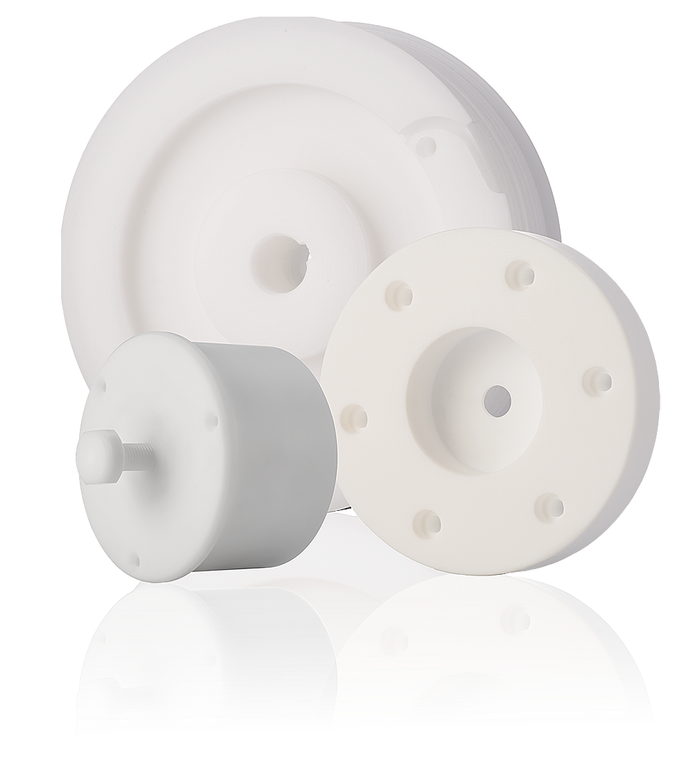 POM – C Polyacetal C | Ein unverstärktes, ungefülltes Polyacetalcopolymer. Hohe mechanische Festigkeit, Steifigkeit, Härte, gute Kriechfestigkeit, hohe Schlagzähigkeit, auch bei niedrigen Temperaturen, sehr hohe Dimensionsstabilität, gute Gleiteigenschaften und Verschleißfestigkeit, hervorragende Zerpanbarkeit, gute elektrische Isoliereigenschaften Lebensmittelrechtlich zugelassen | Bessere chemische Beständigkeit gegen Hydrolyse, starke Laugen und thermisch-oxidativen Abbau. Maschinenteile, Zahnräder, Schaltnocken, mechanische Präzisionsteile |