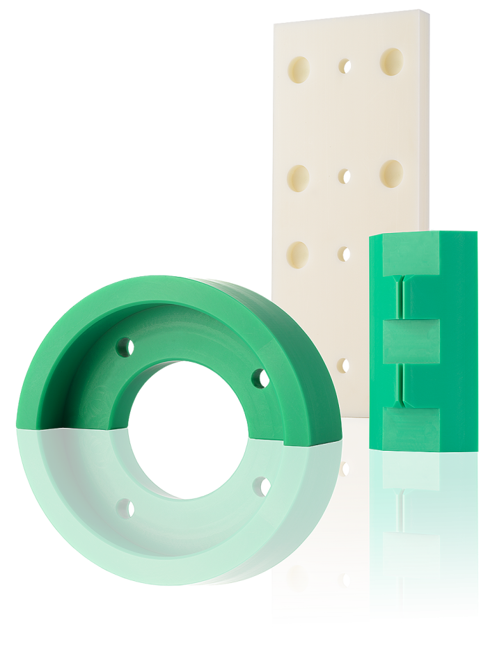 UHM-HDPE | ultrahochmolekular, sehr hohe Abriebfestigkeit, sehr gute Gleiteigenschaften, extrem hohe Kerbschlagzähigkeit; sehr hohe Verschleißfestigkeit, lebensmittelrechtlich zugelassen, Temperatureinsatz von -200°C bis + 80° C | Gleitelemente und techn. Teile mit hoher Abriebfestigkeit, Maschinenbau, Transport-, Förder und Lagertechnik, Schüttgutindustrie, Hafen- und Fenderbau, Verpackungs- u. Abfüllanlagen |
